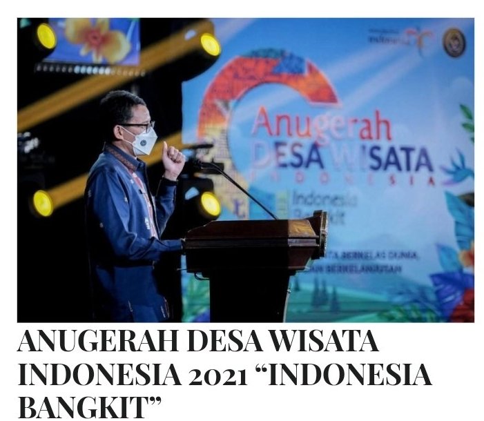 Dalam rangka upaya pemulihan ekonomi nasional akibat pandemi Covid-19, Kementerian Pariwisata dan Ekonomi Kreatif (Kemenparekraf) meluncurkan Anugerah Desa Wisata 2021.